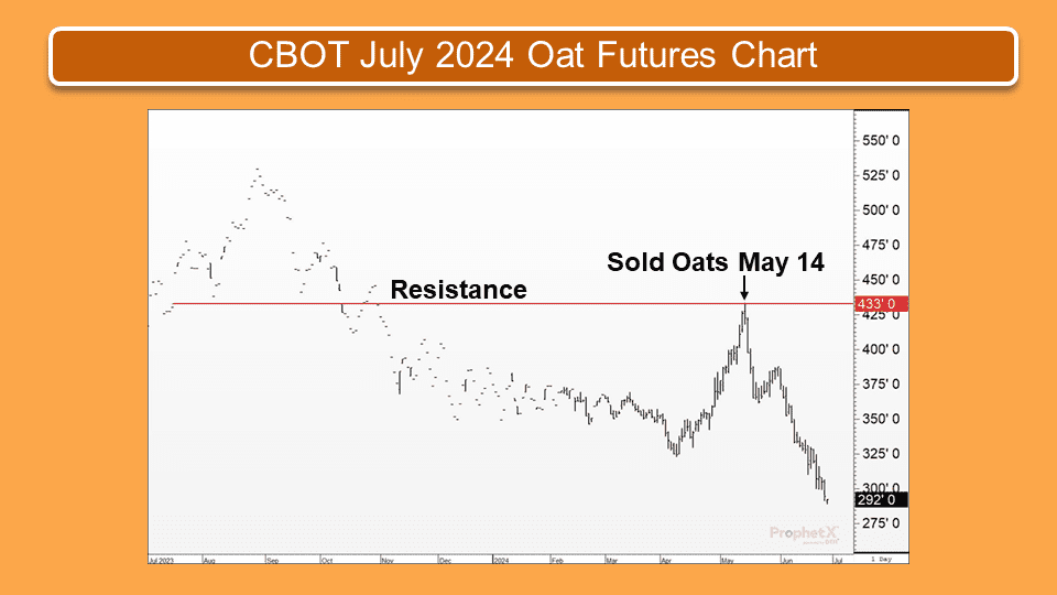 In the accompanying chart, 1) futures rallied into resistance at US$4.33 and 2) were technically overbought, after rallying $1.10 per bushel in the previous 5 weeks. This left the market at risk of turning down, so we made a recommendation for our clients to sell old and new crop oats on May 14, 2024, even though 3) a reversal pattern had not appeared.